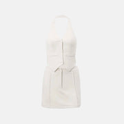Detalhes: Detalhe em "V" no decote e na barra do colete, possui bolsos fakes e botões frontais. Saia com comprimento acima dos joelhos.