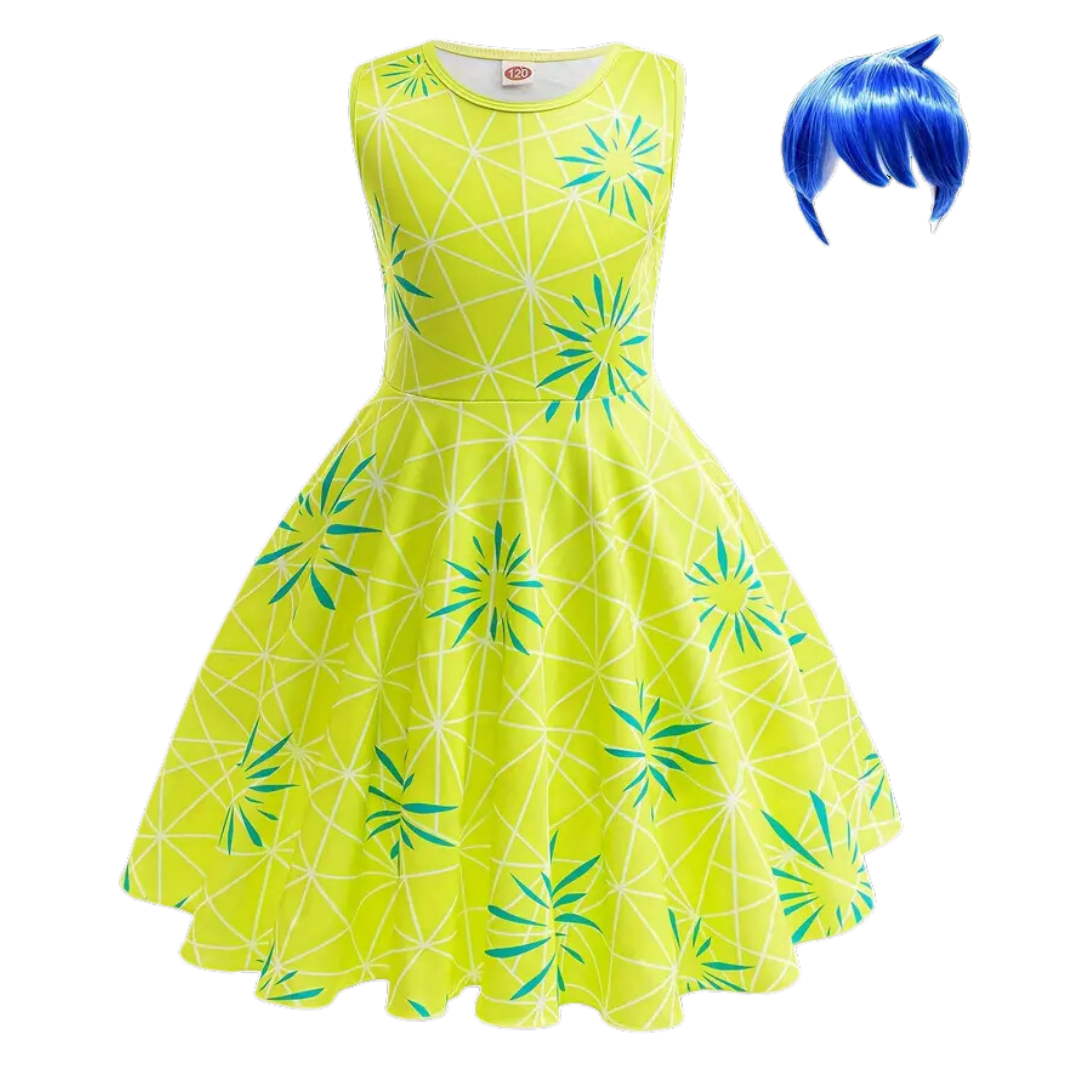 Incluso no pacote: 👗 Vestido amarelo vibrante com estampa inspirada na personagem Alegria. 💇♀️ Peruca azul estilizada para completar o visual cheio de energia!