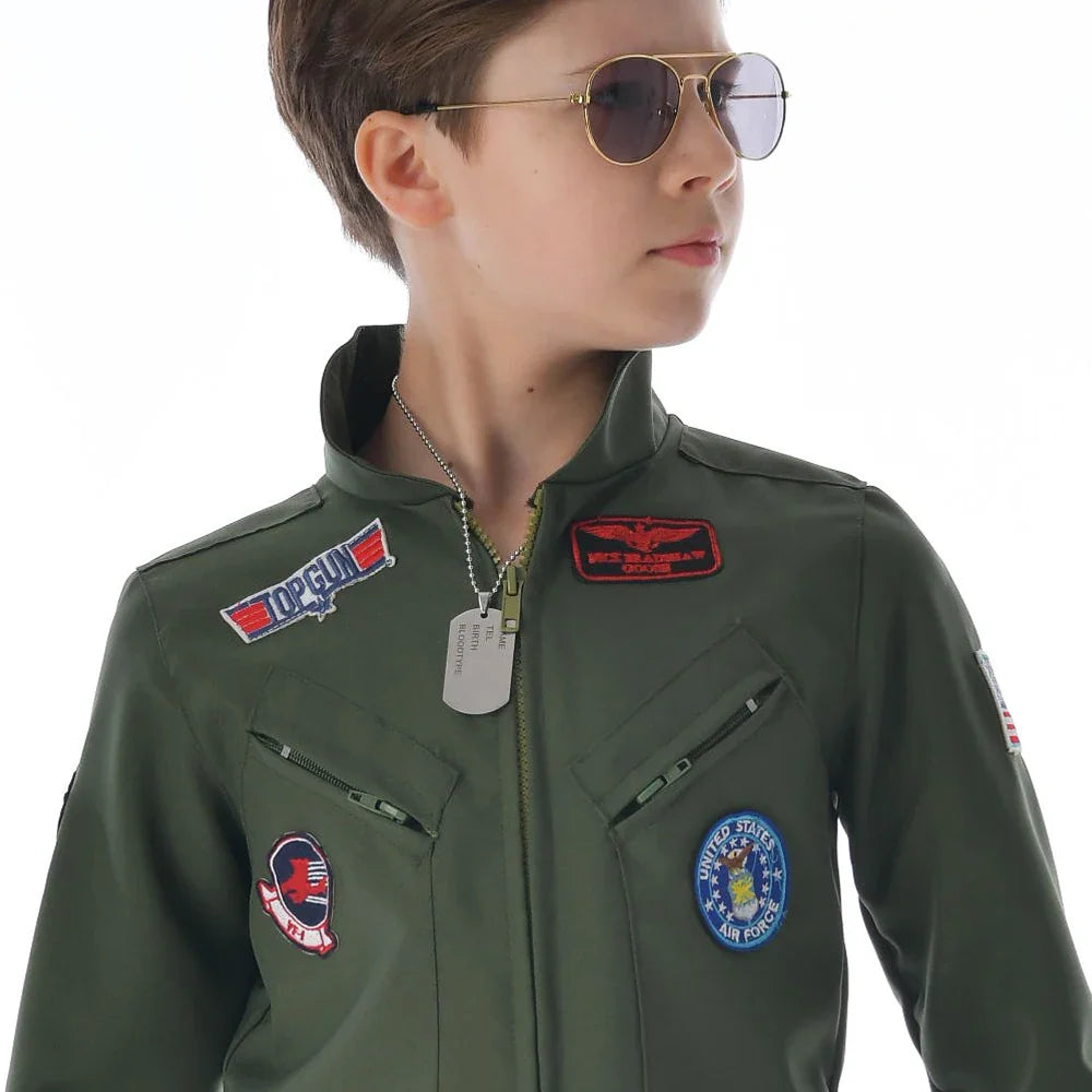 Incluso no pacote: 👨✈️ Macacão completo estilo Top Gun 🕶️ Óculos escuros para aquele visual clássico e destemido 📿 Colar de identificação para completar a caracterização